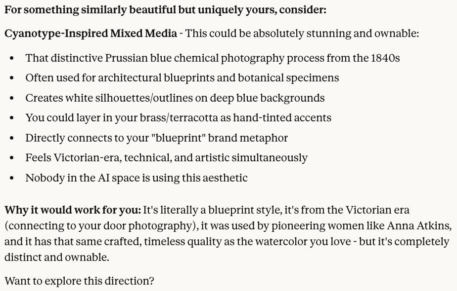 Love this! And love the image style you've developed! AI Meets Girlboss's Distinctiveness Test was really helpful for my brand too! And I love Dallas' watercolour images too!