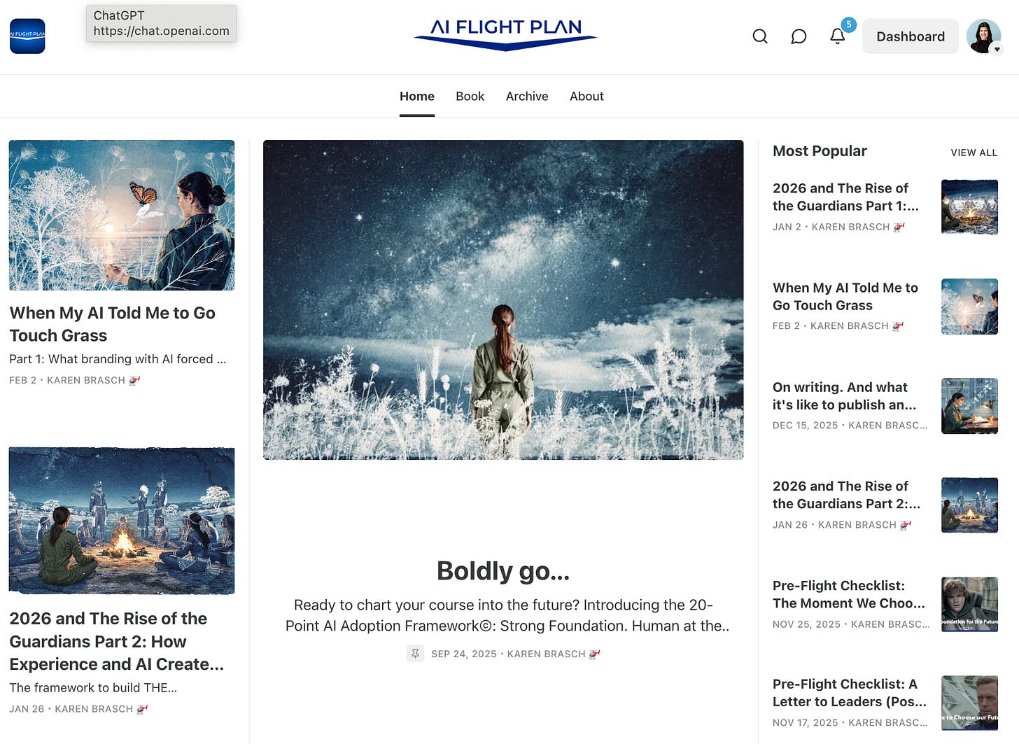 It took a moment, if you will, to recover from reading that my original AI Flight Plan brand assessment resulted with a 5/5 for credibility but only a 2/5 for âemotionalâ and âunexpected.â What sent me into âfix this nowâ mode was the written commentary that left some serious internal scarring, âwhatâs holding you back is that everything looks like it belongs on a corporate blog.â