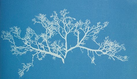 The art medium. Victorian-era cyanotype photographic process made with paper coated with light-sensitive iron salts.